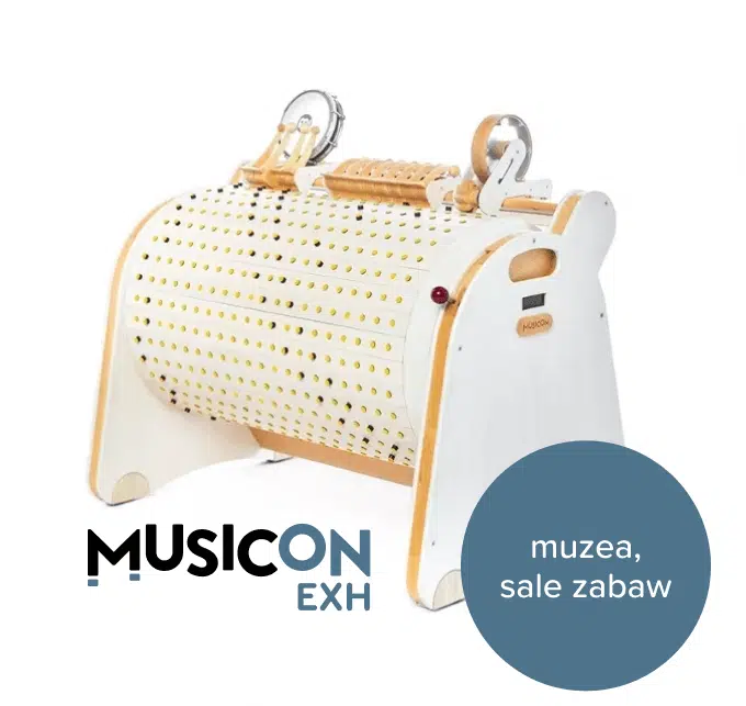 Musicon EXH to urządzenie i pakiet aktywności stworzone do celów wystawienniczych. Wytrzymała bateria oraz zestawy scenariuszy aktywności dla zorganizowanych grup pozwolą na prowadzenie zajęć w muzeum lub sali zabaw.