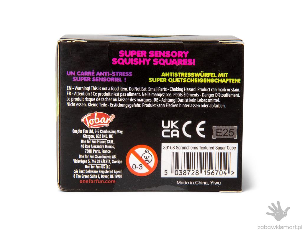 Teksturowana kostka SCRUNCHEMS dostarcza różnorodne wrażenia dotykowe. Jej miękka powierzchnia z wypukłościami zachęca do ugniatania i ściskania. Świetnie sprawdza się jako antystres, a także jako zabawka wspierająca rozwój sensoryczny najmłodszych.