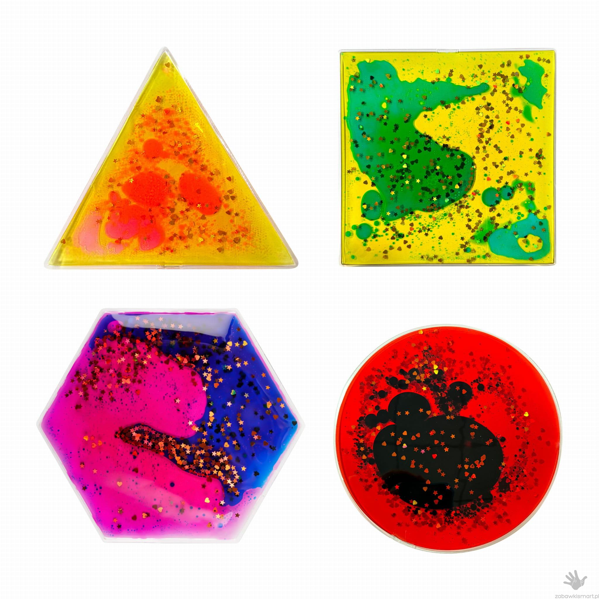 Zestaw antystresowych gniotków sensorycznych Tullo, który pobudza zmysły i relaksuje! W skład kompletu wchodzą cztery kształty geometryczne wypełnione kolorową cieczą i brokatem. Po ściśnięciu można obserwować, jak drobinki płynnie przemieszczają się w środku, tworząc hipnotyzujący i uspokajający efekt.