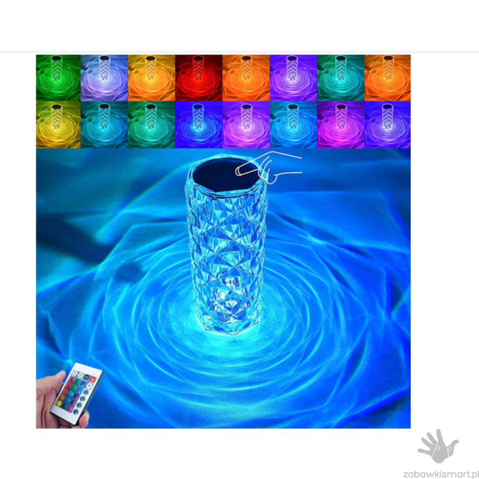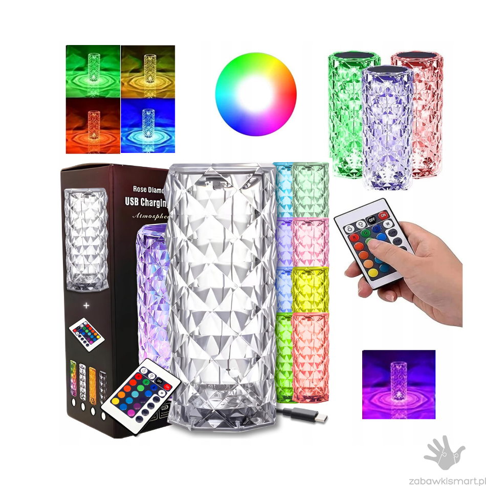 Kryształowa lampa zasilana kablem USB, może świecić także bezprzewodowo przez kilka godzin. Posiada 16 różnych kolorów wybieranych pilotem lub poprzez dotyk przełącznika na czubku.
