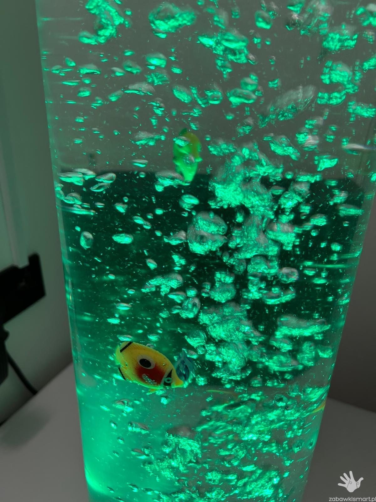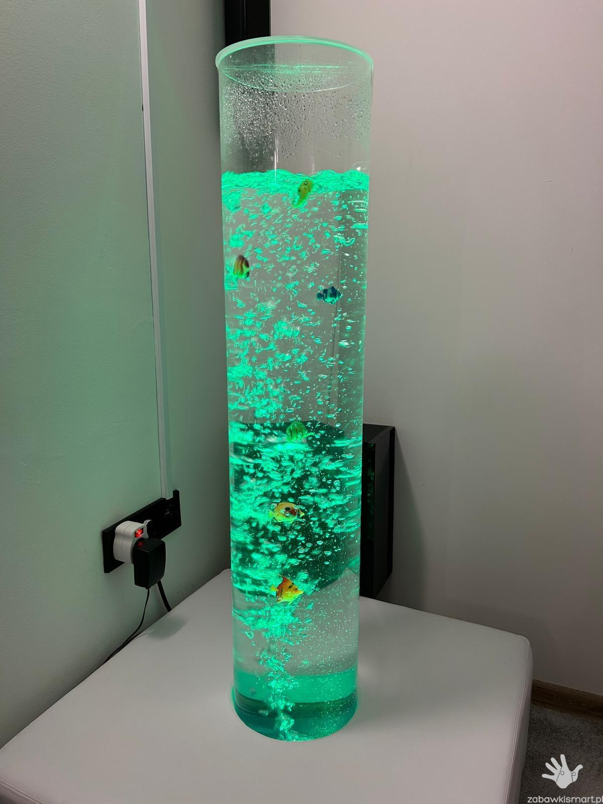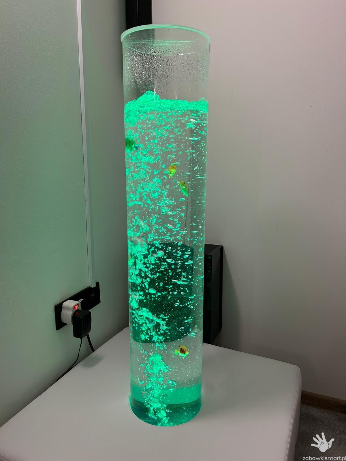 Wykonana jest z przezroczystej, bezpiecznej rury, zamontowanej w stabilnej, drewnianej podstawie. Od spodu wydostaje się powietrze, które wywołuje powstawanie wodnych bąbelków przepływających w strumieniu łagodnie zmieniającego się światła- co dostarcza miłych wrażeń wzrokowych.