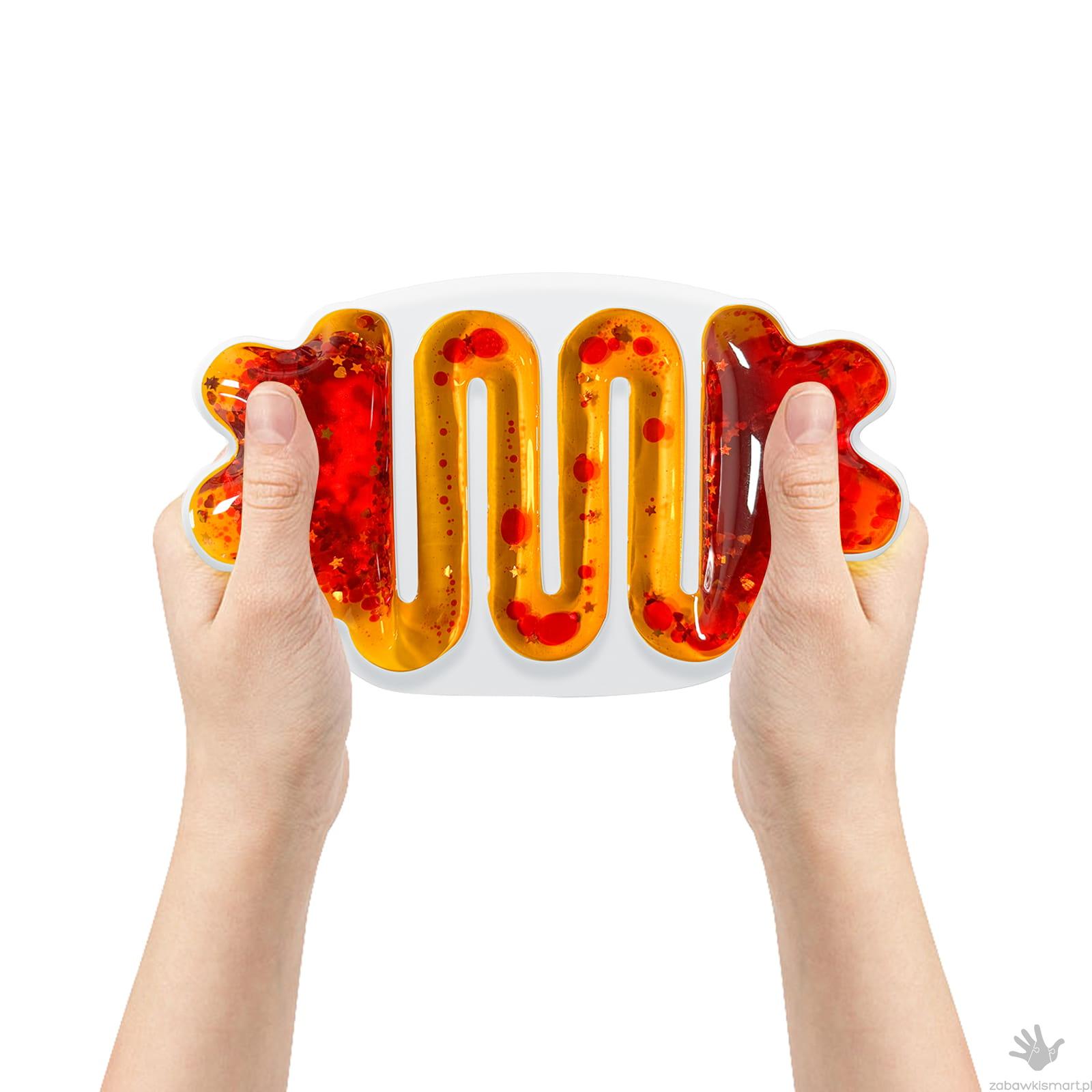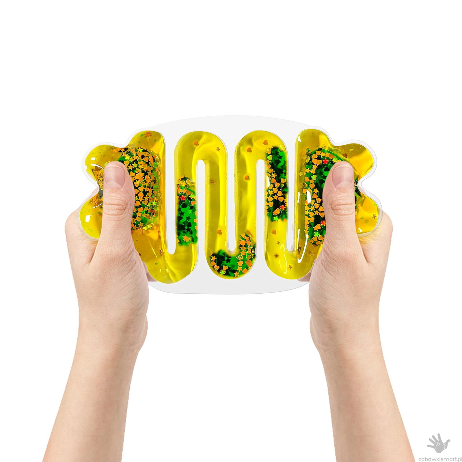 Miękki kolorowy gniotek wypełniony cieczą i brokatem, które płynnie przemieszczają się po specjalnym labiryncie. Wystarczy lekko go ścisnąć, by zobaczyć, jak błyszczące drobinki poruszają się w hipnotyzujący sposób, tworząc efekt uspokajającego przepływu.