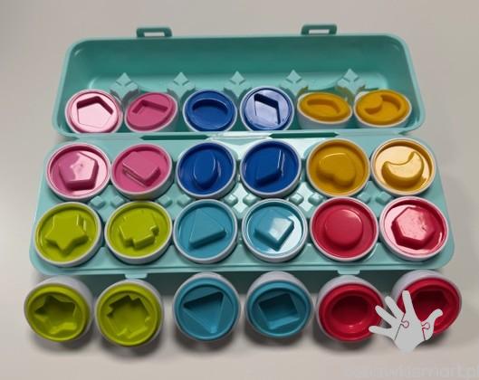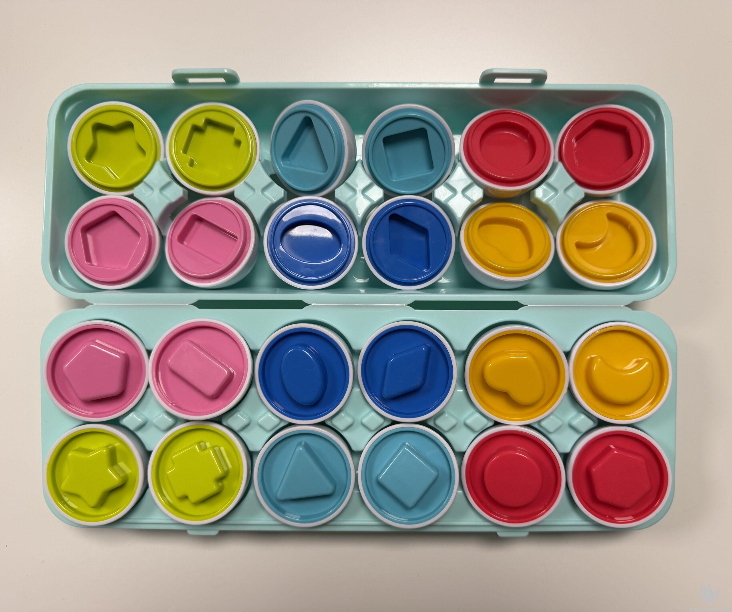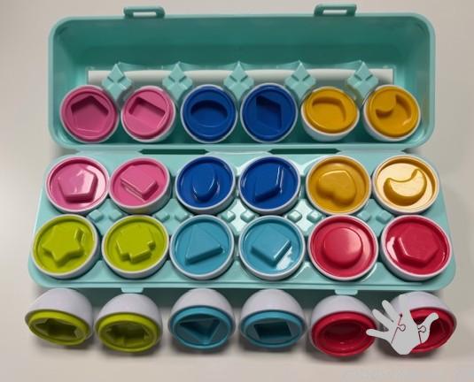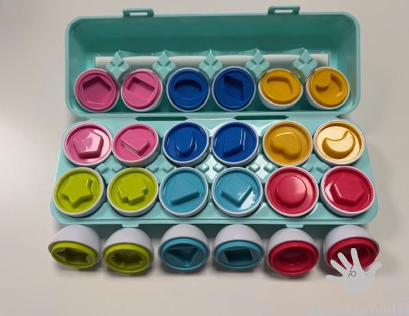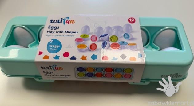 W wytłaczance znajduje się 12 całkiem niezwykłych, bo sensorycznych jajek. Zadaniem malucha jest porozdzielać je na połówki, a następnie z powrotem prawidłowo dopasować je do siebie, sugerując się kształtami, znajdującymi się w ich wnętrzu. Ta pomysłowa wariacja na temat sortera kształtów wprowadzi najmłodszych do świata figur i kolorów, pomagając im przy tym rozwijać zdolności poznawcze i odkrywać zależności przyczynowo- skutkowe.