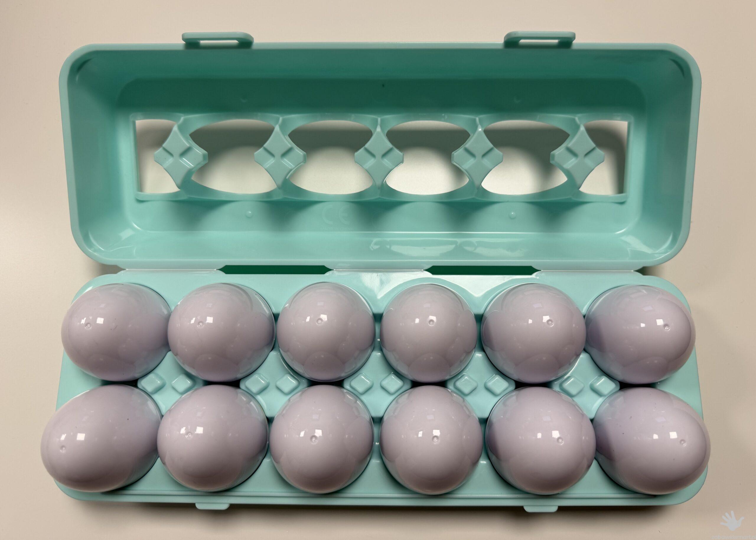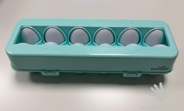 - w zestawie 12 jajek (do rozdzielenia na pół) i zamykane opakowanie na jajka w kształcie wytłaczanki