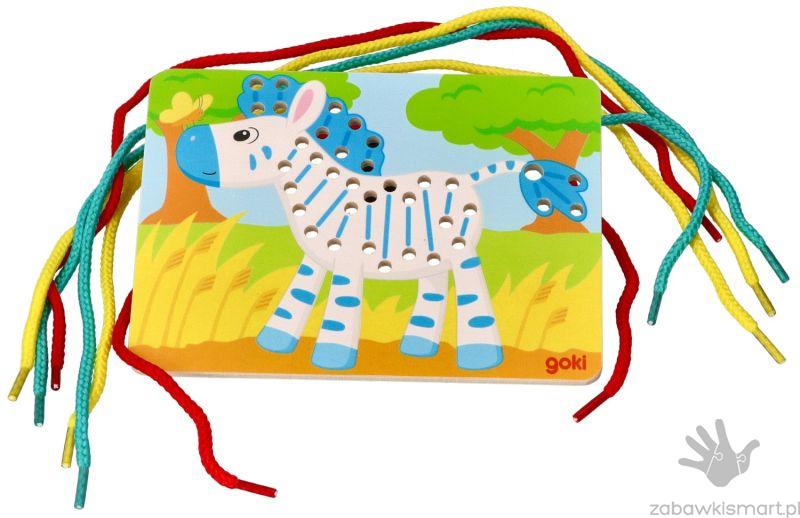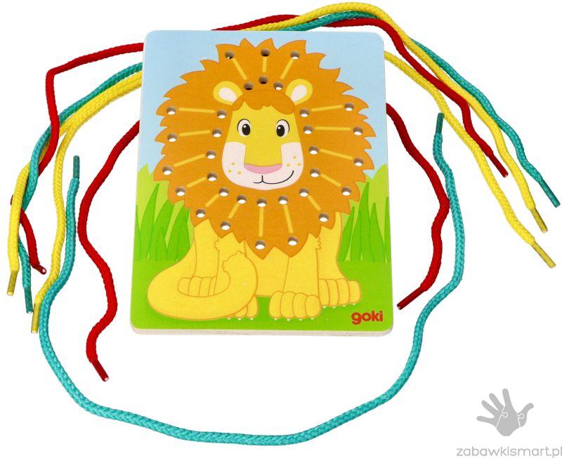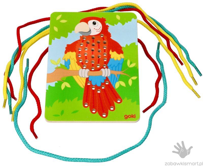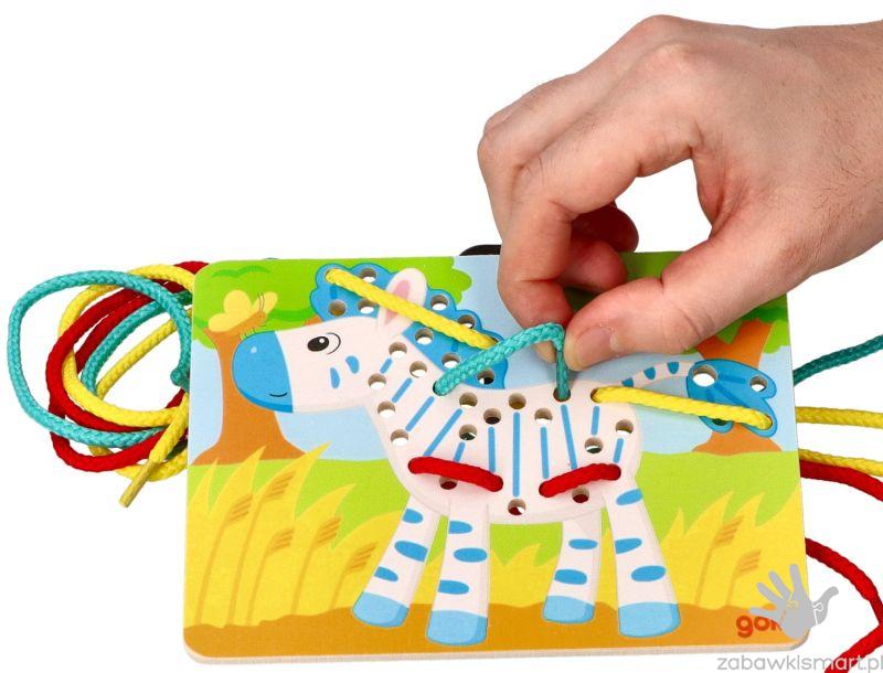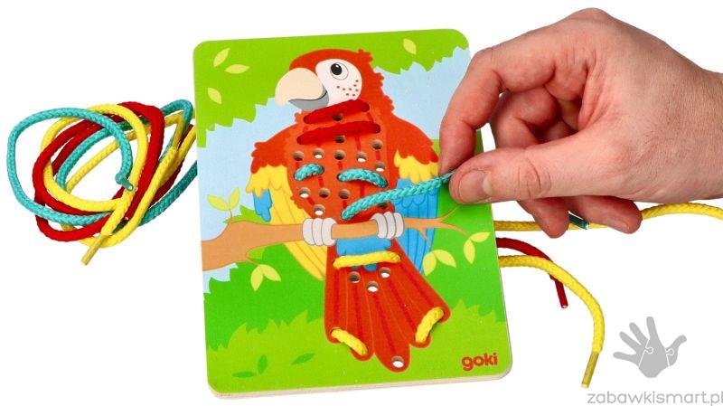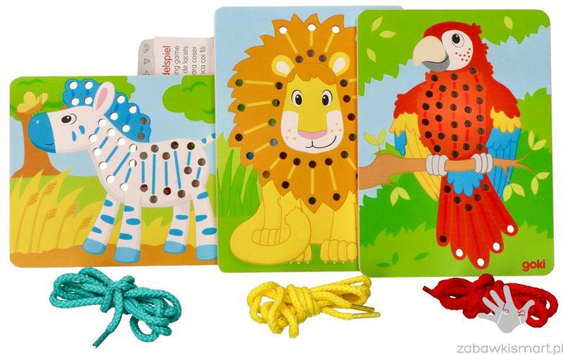 - 3 drewniane tablice z otworami do przeplatania (papuga, lew, zebra),